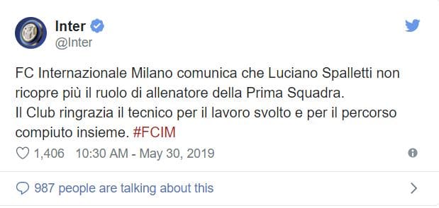 “FC Internazionale Milano comunica che Luciano Spalletti non ricopre più il ruolo di allenatore della Prima Squadra. Il Club ringrazia Spalletti per il lavoro svolto e per il percorso compiuto insieme”. È con questo striminzito comunicato che l’Inter ha annunciato l’esonero del suo allenatore.