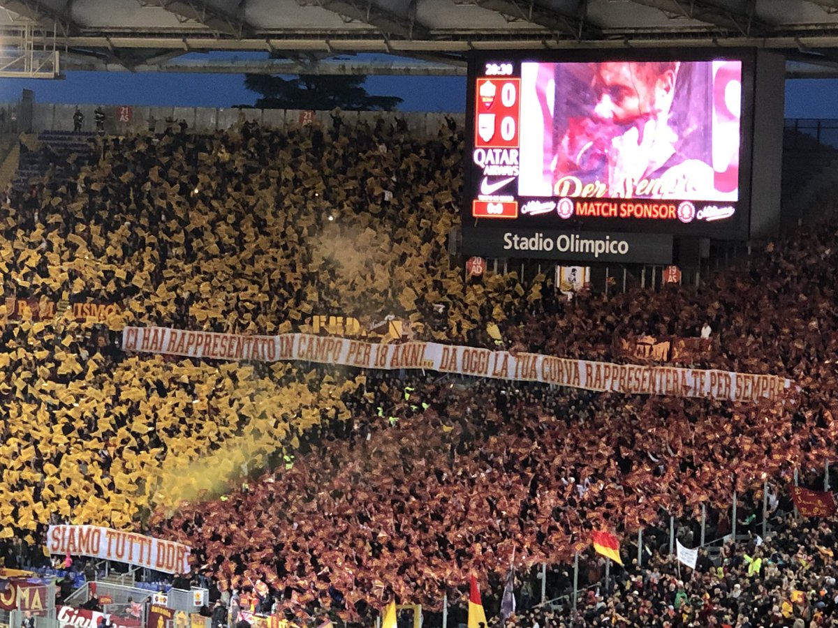 Ma non solo. All’Olimpico sono tantissimi gli attestati di stima per il centrocampista giallorosso: striscioni, bandiere, maglie e tantissimi cori.