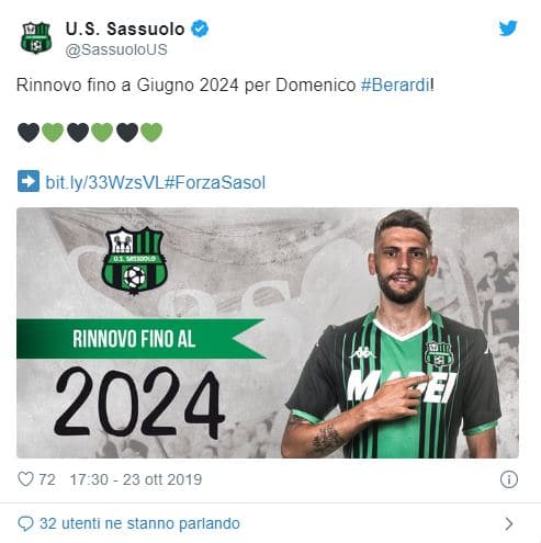 Questo il comunicato ufficiale del Sassuolo sul rinnovo di Domenico Berardi: