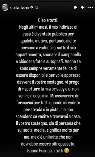 “Ciao a tutti. Negli ultimi mesi il mio indirizzo di casa è diventato pubblico per qualche motivo, portando molte persone a radunarsi sotto il mio appartamento, suonare il campanello e chiedere foto e autografi”, ha scritto Leclerc.