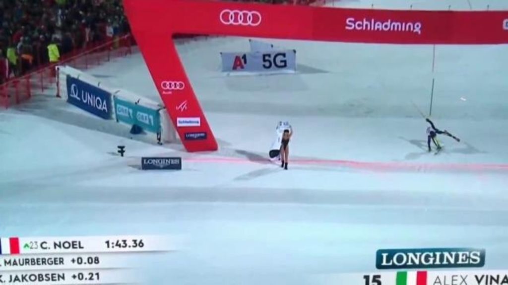 Sulla Planai di Schladming nel corso della “The Night Race“, la notturna di slalom valida per la Coppa del mondo di sci, l’italiano Alex Vinatzer è stato beffato da una ragazza in costume da bagno che ha invaso la pista e ha tagliato il traguardo poco prima dello sciatore azzurro.