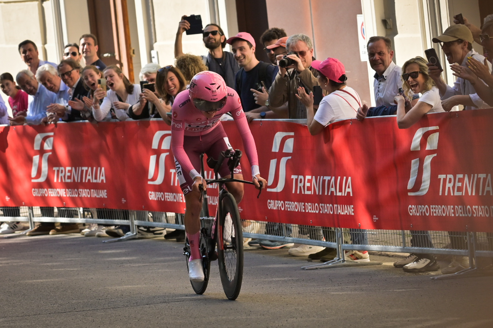 Nel 90° anniversario della maglia rosa, indossata per la prima volta da Learco Guerra nella sua Mantova il 10 maggio 1931, Tadej ha calato sul tavolo una delle prestazioni più eccelse della sua ancor giovane carriera. Partito tranquillamente, ha accusato un distacco di 36″ da Ganna al primo intermedio di Santa Maria degli Angeli dopo 18,6 chilometri. Al secondo rilevamento di Ponte Valleceppi, dopo 34 chilometri, il ritardo dello sloveno sul verbanese era salito a 47″. Ne consegue che nei 6.600 metri dell’ascesa fino a Perugia, Pogacar ha inflitto a Ganna 1’04: un’impresa ai limiti dell’impossibile. Difficile pensare che qualcuno possa contrastarlo sulla strada, ancor lunga, che porta ai Fori Imperiali.