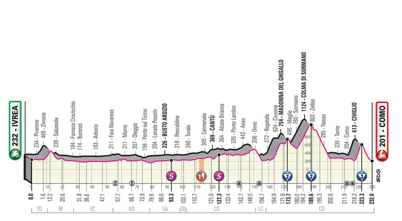 La tappa di oggi, domenica 26 maggio, prevede i primi 160 chilometri completamente pianeggianti attraverso zone ad alta densità di popolazione. Dopo gli attraversamenti di Cantù e Erba si arriva a Pusiano e Asso. Discesa su Onno e lungo lago fino a Bellagio dove inizia la salita del Ghisallo. Salita con pendenze fino al 14 per cento su strada ampia con diversi tornanti.