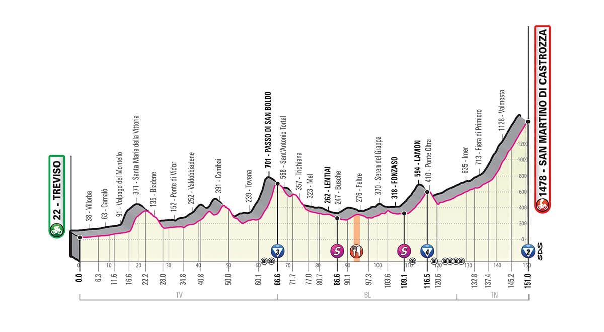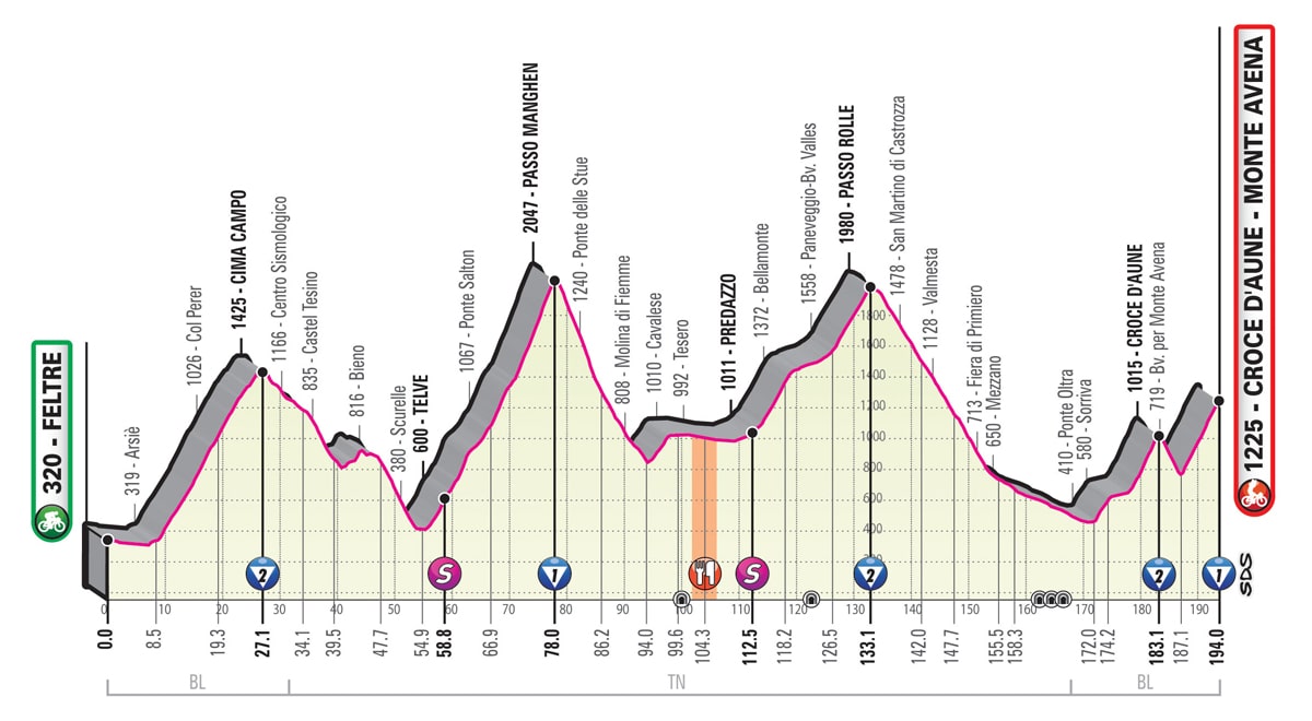 Poi altri 116 chilometri prima dell’arrivo. Dopo una lunga discesa ed un tratto in falsopiano, inizierà il Passo Rolle. Dopo una discesa di quasi 40 chilometri, il Croce d’Aune (11 chilometri), poi l’arrivo in salita sul Monte Avena: 6,9 chilometri al 7,3 per cento di pendenza media e punta dell’11 per cento.