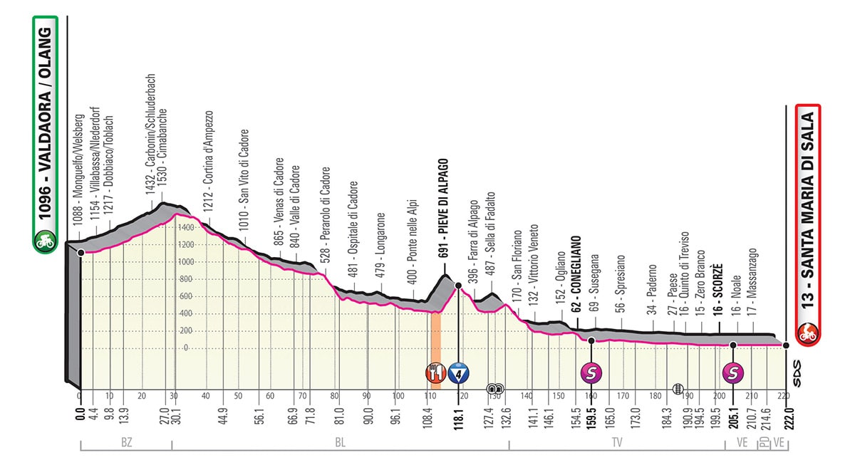 Un solo GPM di quarta categoria posto lontano dal traguardo, il Pieve di Alpago, poi quasi tutta discesa e pianura.