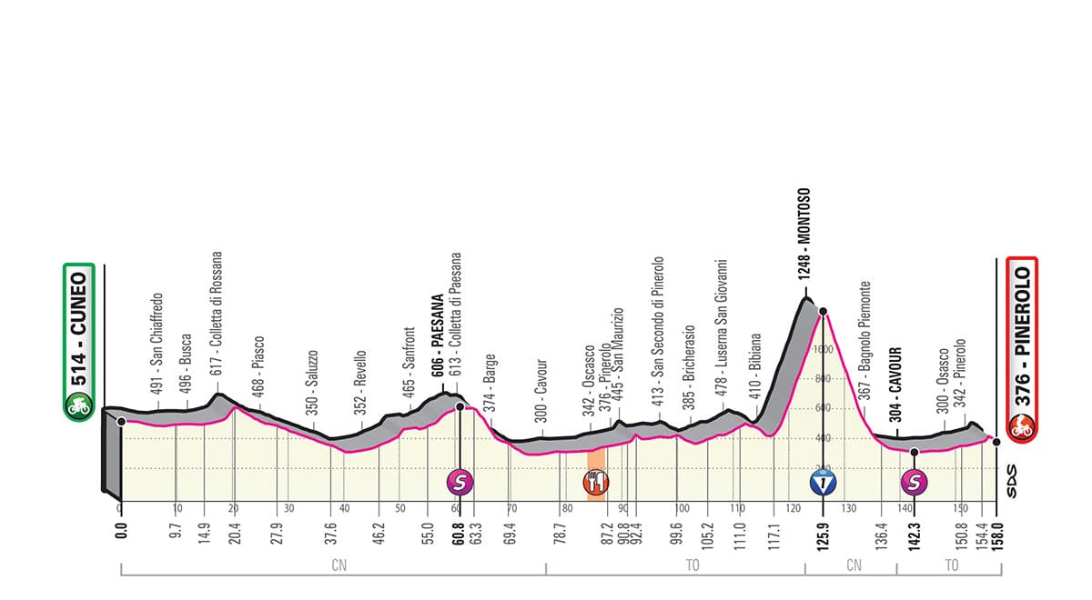 Si tratterà di una frazione di media montagna. I corridori scaleranno il primo GPM di prima categoria di questa edizione del Giro d’Italia, il Montoso: 8,8 chilometri al 9,5 per cento di pendenza media e massima del 14 per cento.