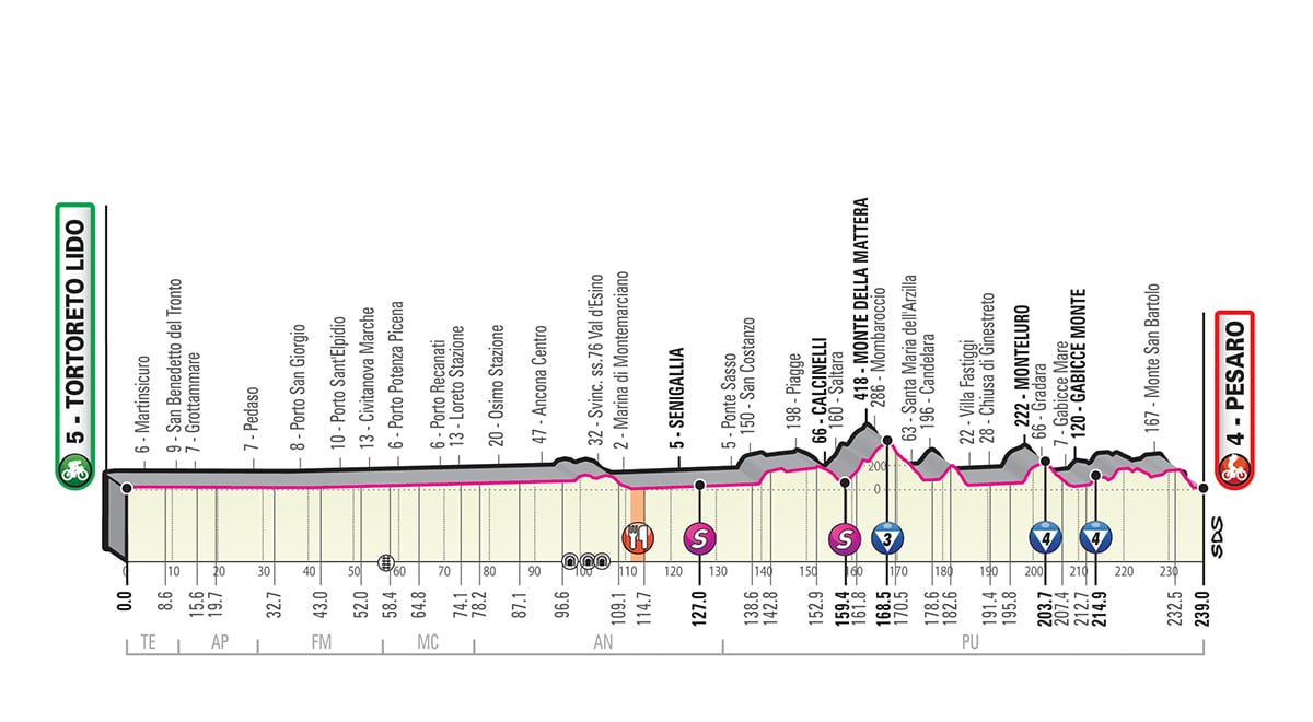 È la tappa più lunga del Giro d’Italia 2019. I primi 160 chilometri sono completamente pianeggianti, dopodiché si entra nel vivo. In successione: Monte della Mattera, Monteluro e Gabicce Monte. Gli ultimi 7 chilometri si prestano a dei colpi di mano grazie ad una discesa molto tecnica.
