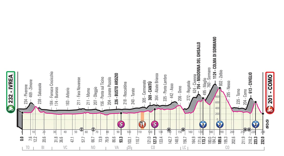 Presenti Madonna del Ghisallo (8,6 chilometri al 5,6 per cento, i primi 3,5 chilometri sono al 9,2 per cento), Colma di Sormano e, soprattutto, la salita di Civiglio (4,2 chilometri al 9,7 per cento e punta del 14 per cento), la cui vetta sarà posta a poco meno di 9 chilometri dall’arrivo, tutti in discesa.