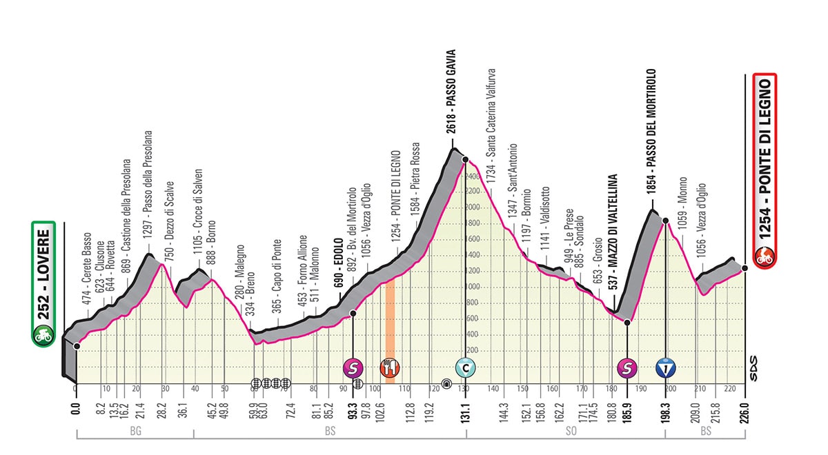 La Tappa Regina del Giro d’Italia 2019. Dopo l’ultimo giorno di riposo, i corridori saranno attesi ad un tappone infernale. Due salite massacranti: Gavia e Mortirolo. In avvio: Passo della Presolana (4 chilometri al 7,1 per cento) e Croce di Salven (9,1 chilometri al 3,9 per cento). Al chilometro 93,3 inizierà il Passo Gavia, Cima Coppi di questa Corsa Rosa con i suoi 2618 metri di altitudine.