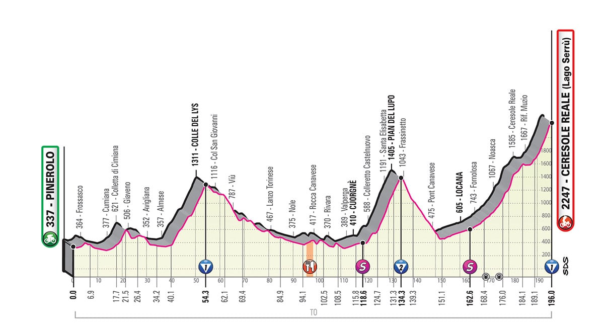 La montagna. Dopo 54 chilometri il Colle del Lys, GPM di prima categoria (14,9 chilometri al 6,4 per cento di pendenza media e massima del 12 per cento). Dopo una lunghissima discesa, il Pian del Lupo, salita inedita: 9.4 chilometri all’8,7 per cento di pendenza media. Dopo una discesa di 17 chilometri, si salirà per ben 44 chilometri verso Ceresole Reale. Gli ultimi 6 chilometri prima dell’arrivo saranno al 9 per cento. TAPPA A RISCHIO NEVE: qui tutte le news