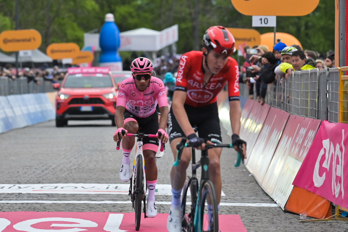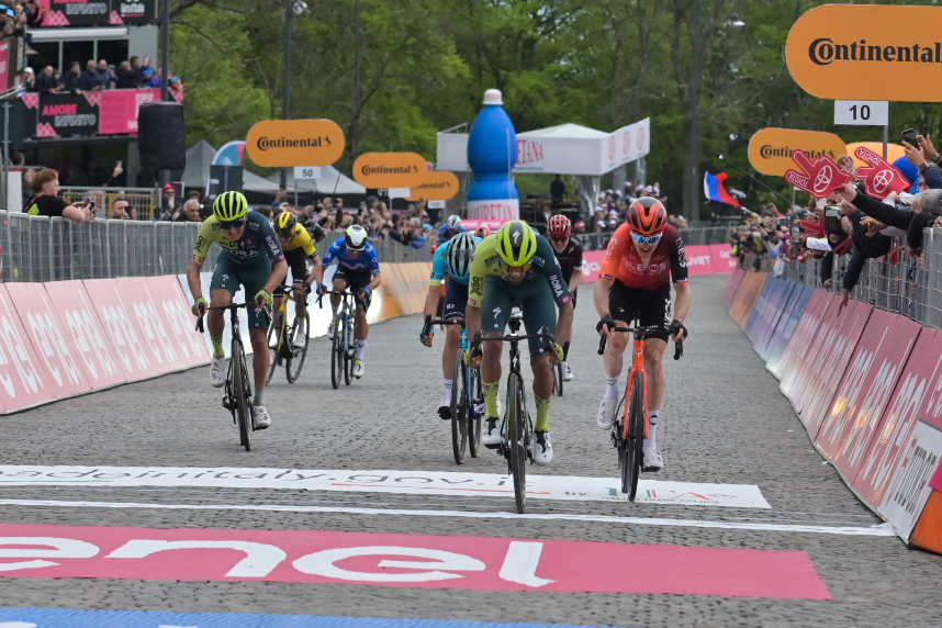 Dopo che il connazionale di Pogacar, Domen Novak, districandosi in mezzo al plotone, lo aveva pilotato in prima fila, prendevano il comando delle operazioni Felix Großschartner e Rafal Majka. L’austriaco, prima, e il polacco, dopo, imprimevano al gruppo un ritmo forsennato che provocava una fortissima selezione. A 6.500 metri dall’arrivo, proprio nel momento in cui il gruppo agguantava Andrea Piccolo (EF Education Easy Post), ultimo superstite della fuga di giornata, che lo aveva anche proiettato virtualmente in maglia rosa, Tadej sferrava il suo attacco, cui resisteva inizialmente solo l’australiano Ben O’Connor (Decathlon AG2R). Liberatosi del corridore di Subiaco, Pogacar procedeva indisturbato verso la vittoria con gli avversari concentrati sul limitare i danni.