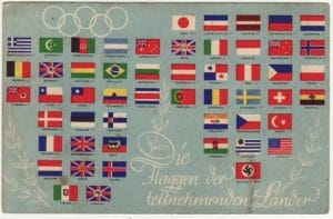 Sotto: bandiere dei Paesi partecipanti alle Olimpiadi 1936. In questa cartolina Haiti e Liechtenstein non hanno la stessa bandiera perché per il paese caraibico è stata inserita quella che all’epoca non era utilizzata per l’uso civile.