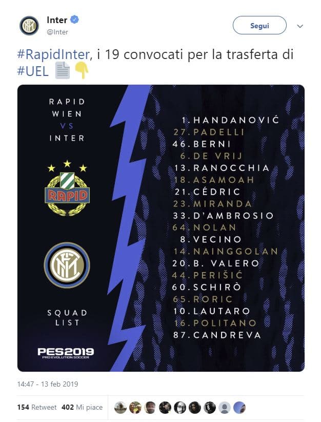 Come si evince da un altro tweet dell’Inter, infatti, Icardi non è stato nemmeno convocato per l’importante match.