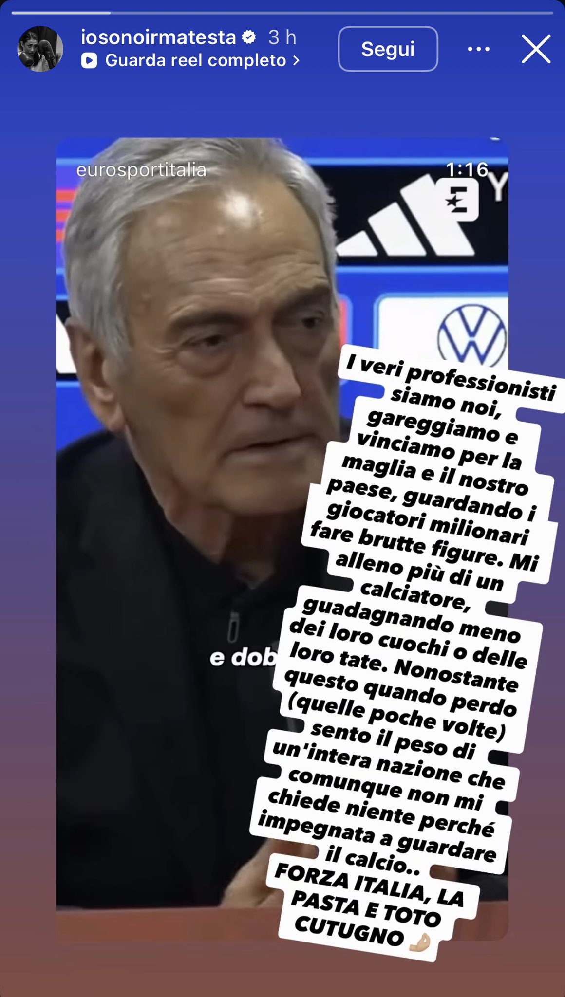 E ancora: “Mi alleno più di un calciatore, guadagnando meno dei loro cuochi o delle loro tate – scrive Testa -. Nonostante questo quando perdo (quelle poche volte) sento il peso di un’intera Nazione che comunque non mi chiede niente perché impegnata a guardare il calcio.. Forza Italia, la pasta e Toto Cutugno”. Irma Testa, però, non è l’unica azzurra che si è scagliata contro Gravina. Tommaso Giacomel, argento nel biathlon ai recenti Giochi, ha infatti scritto sui social: “Se il calcio è professionismo, allora Sinner è un amatore. Avanti così”.