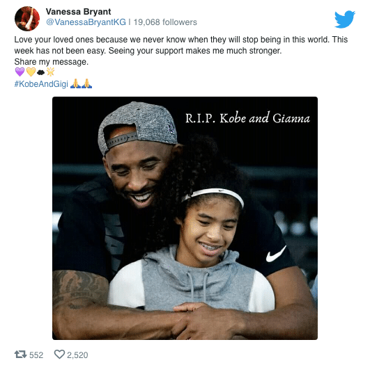 “Ama i tuoi cari perché non sapremo mai quando se ne andranno. Questa settimana non è stata facile, ma sentire il vostro supporto mi ha reso più forte. Condividi il mio messaggio”, scrive la moglie di Kobe Bryant su Twitter.