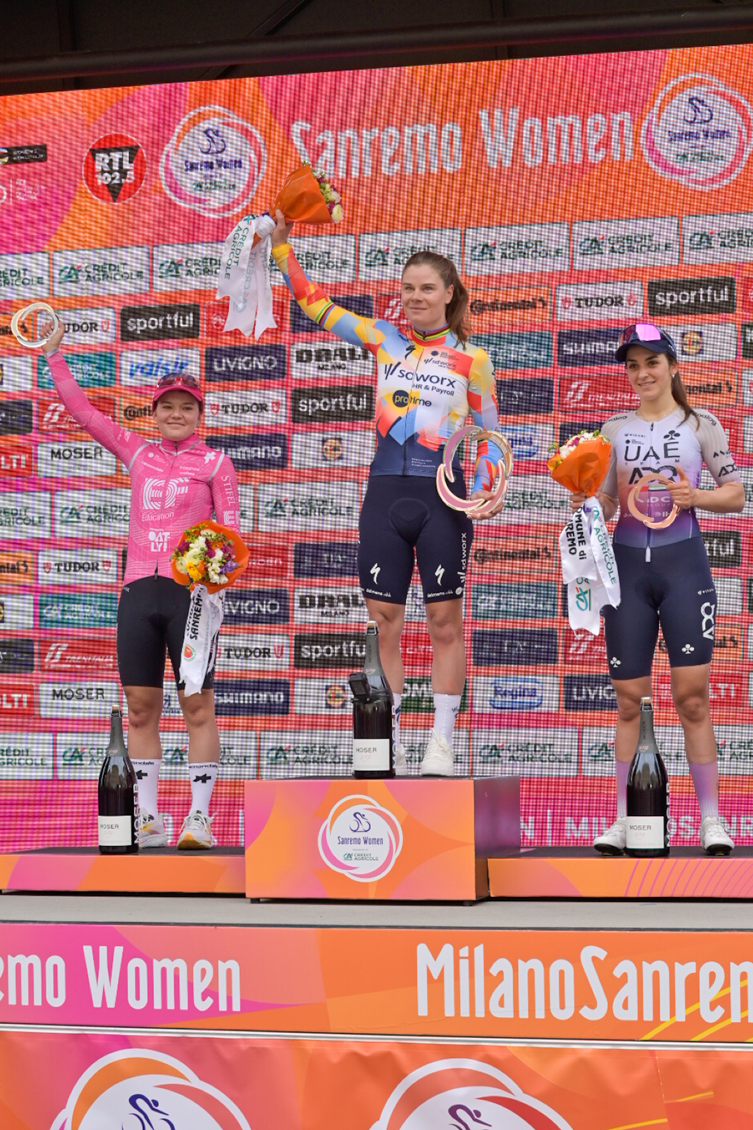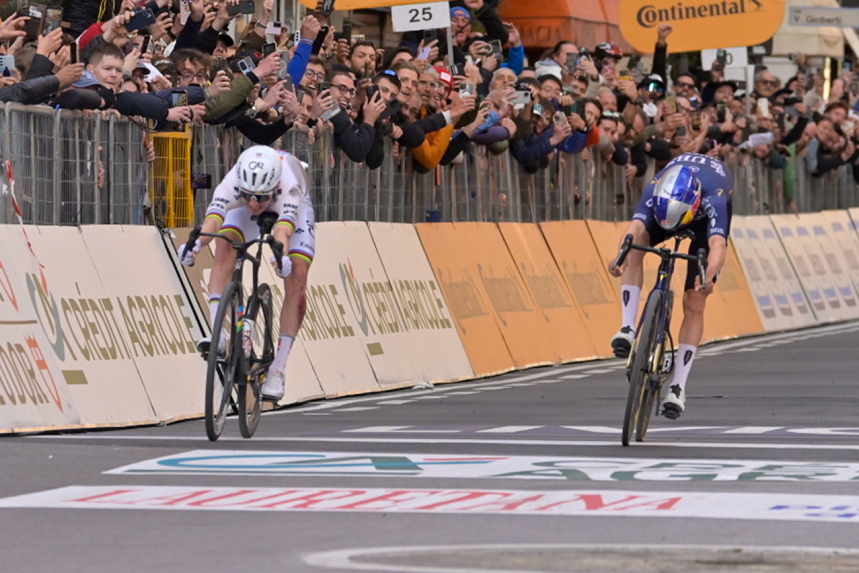 I tre battistrada, rientrati sull’Aurelia con 35 secondi di vantaggio sugli inseguitori hanno dosato le forze nei 10 chilometri che hanno portato all’imbocco del Poggio, preso con soli otto secondi di vantaggio. Appena iniziata la salita, la maglia iridata ha rotto gli indugi, producendo una raffica di scatti che hanno causato il cedimento di van der Poel. Pidcock, invece, forte della forma che lo ha portato a trionfare a Superga mercoledì scorso nella Milano-Torino, non ha ceduto un centimetro. Rientrato sulla SS1, a 2.300 metri dall’arrivo, il duo ha nuovamente rallentato, permettendo a van Aert d’arrivare a un passo da un miracoloso ricongiungimento. Pogacar, trovatosi inopinatamente a dover condurre una volata di testa ha ridotto lo sprint ai minimi termini, partendo a soli 100 metri dallo striscione finale così da non concedere a Pidcock spazio per effettuare il sorpasso in scia.