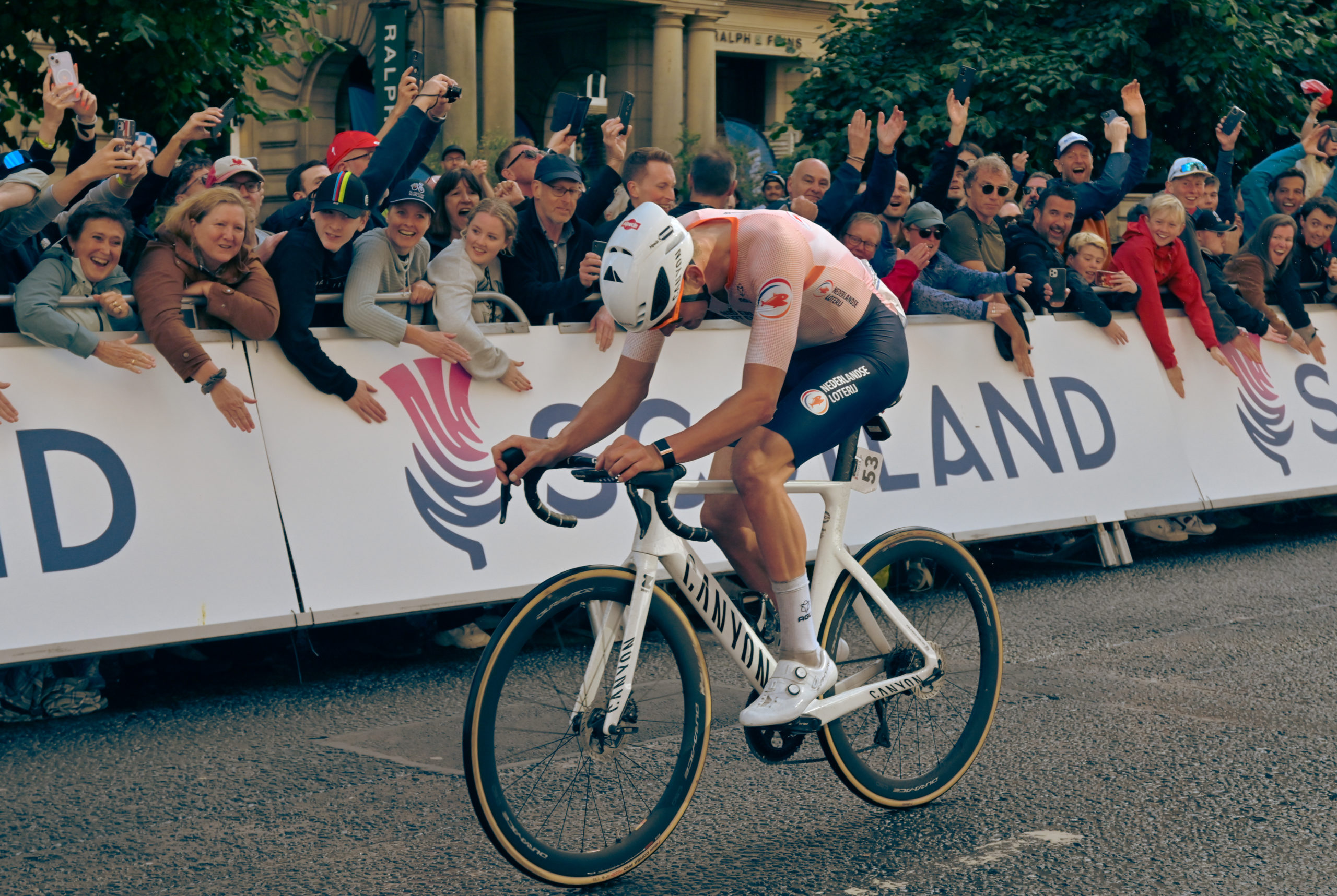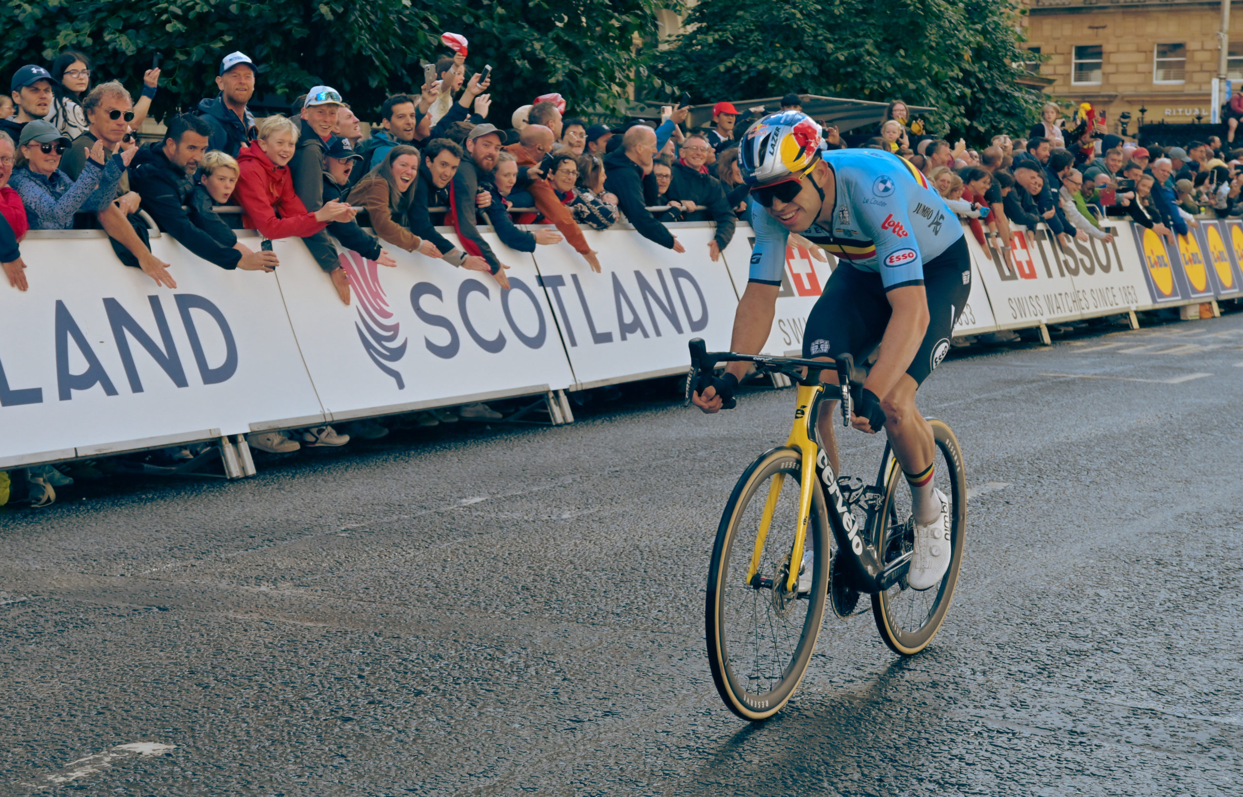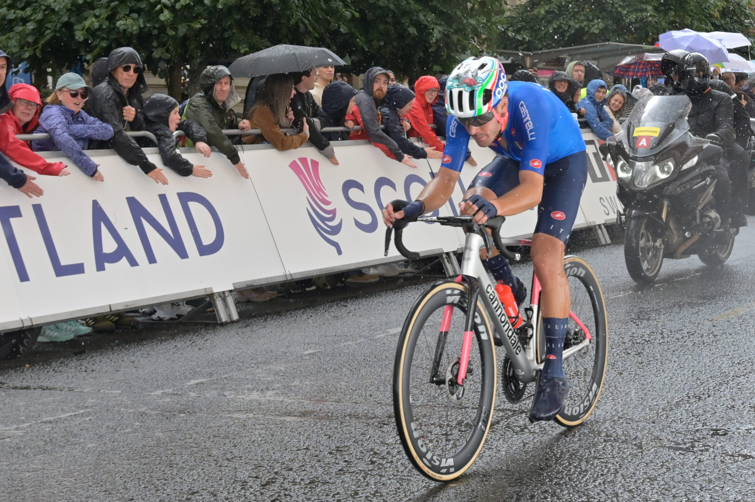L’azione è entrata nel vivo con l’ingresso nel circuito di Glasgow, un anello di 14.300 metri comprendente ben otto strappi da ripetersi 10 volte. Dopo una cinquantina di chilometri disputati in modo anarchico, quasi fosse una competizione dilettantistica, s’ergevano chiaramente a protagonisti in cinque: Pedersen, Pogacar, Van Aert, van der Poel e, gradita sorpresa, Bettiol. Erano proprio costoro, ai meno 80, a effettuare il ricongiungimento con gli attaccanti della prima ora. Dopo un temporaneo ricompattamento del gruppo, a 55 dal traguardo partiva Bettiol, non prima d’aver rischiato di finire per terra a causa d’una borraccia che gli aveva colpito la ruota. Il senese sperava in una ripetizione di quanto avvenuto al Giro delle Fiandre 2019 quando un marcamento stretto tra i grandi gli creò lo spazio per un clamoroso successo con un’analoga azione da lontano. In parte, il suo tentativo sortiva l’effetto desiderato. Il Belgio si metteva in testa, producendo, però, un’andatura non troppo veemente che limitava a mezzo minuto il vantaggio dell’azzurro ai meno 40 dall’arrivo.