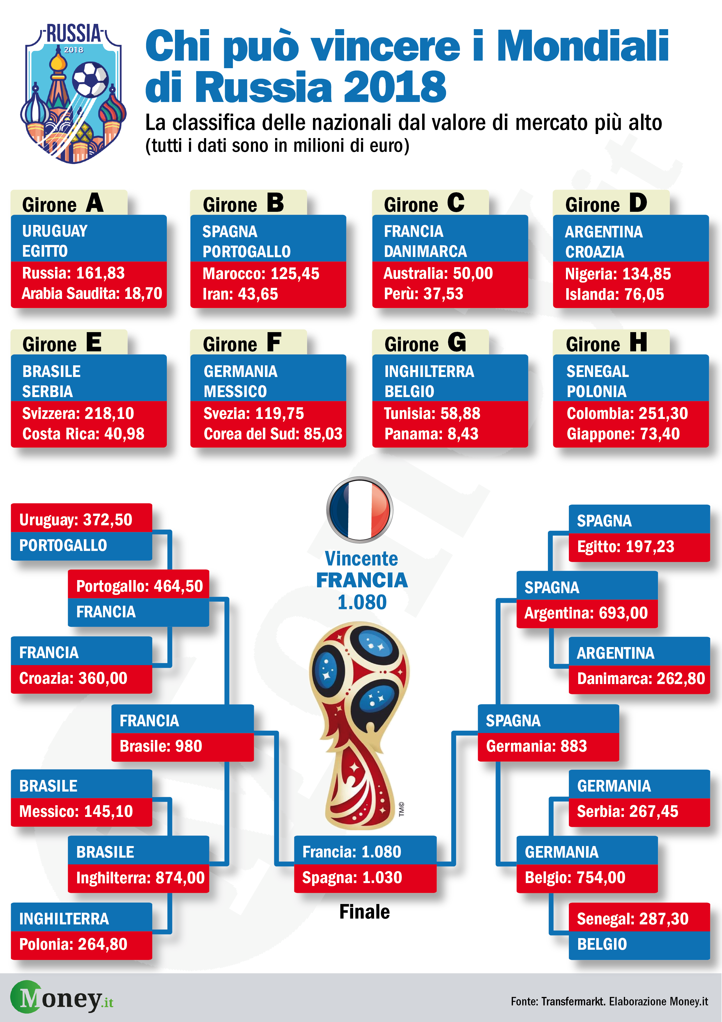 Secondo il pronostico basato sul valore delle rose (e non dei giocatori in campo), a trionfare nella finale a Mosca sarebbero Les Bleus di Deschamps, dopo un testa a testa con la Spagna.