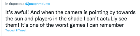 “È orribile! E quando la telecamera punta verso il sole e i giocatori sono all’ombra non riesco proprio a vederli! È uno dei peggiori giochi che io ricordi”, ha commentato un altro.