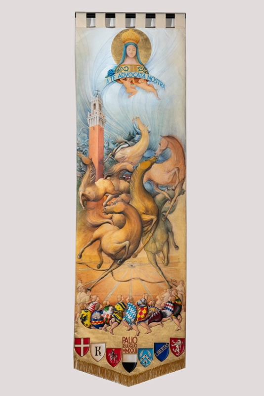 Qual è il drappellone per il Palio di Siena del 2 luglio 2023 dedicato alla Madonna di Provenzano? Il premio che sarà consegnato alla contrada vincitrice del Palio è stato realizzato dall’artista Roberto Di Jullo. Le figure sembrano comunicarsi, fra sé, movimento e armonia; i cavalli si intrecciano in un segno che è moto e energia pura, avviluppati in un nodo che sviluppa forme nuove, materia indisciplinata e riottosa a ogni coercitiva domesticazione. Di seguito la foto del drappellone in palio oggi, 2 luglio: