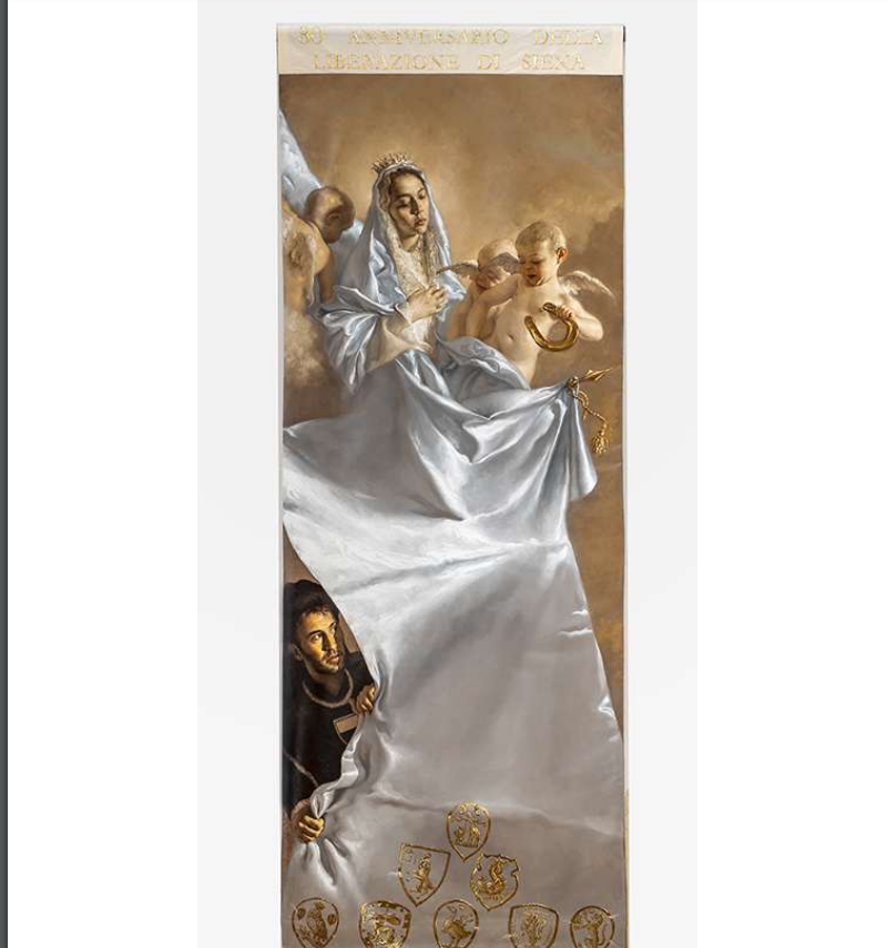 Abbiamo visto chi ha vinto (il vincitore) il Palio di Siena del 4 luglio 2024, ma qual è il drappellone conquistato dalla contrada? Il premio che è stato consegnato alla contrada vincitrice del Palio è stato realizzato dall’artista Giovanni Gasparro. Una Vergine che avvolge con il suo manto azzurro la città e i ricami dorati che evocano il divino. L’oro che evoca la divinità benedice le contrade e, particolare di quest’anno, c’è il riferimento agli ottanta anni dalla Liberazione di Siena avvenuta il 3 luglio del 1944. Di seguito l’immagine: