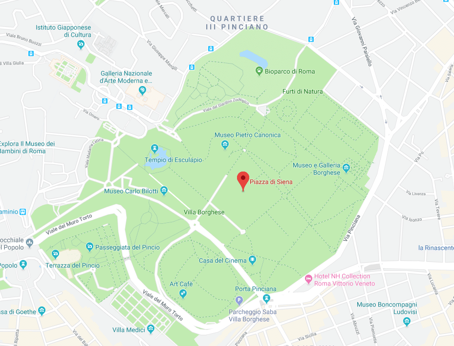 Piazza di Siena si trova all’interno di Villa Borghese, polmone verde nel pieno centro di Roma. Raggiungerla è più semplice di quanto si possa pensare. Scordatevi però di arrivarci con mezzi privati (auto, moto, motorini…).