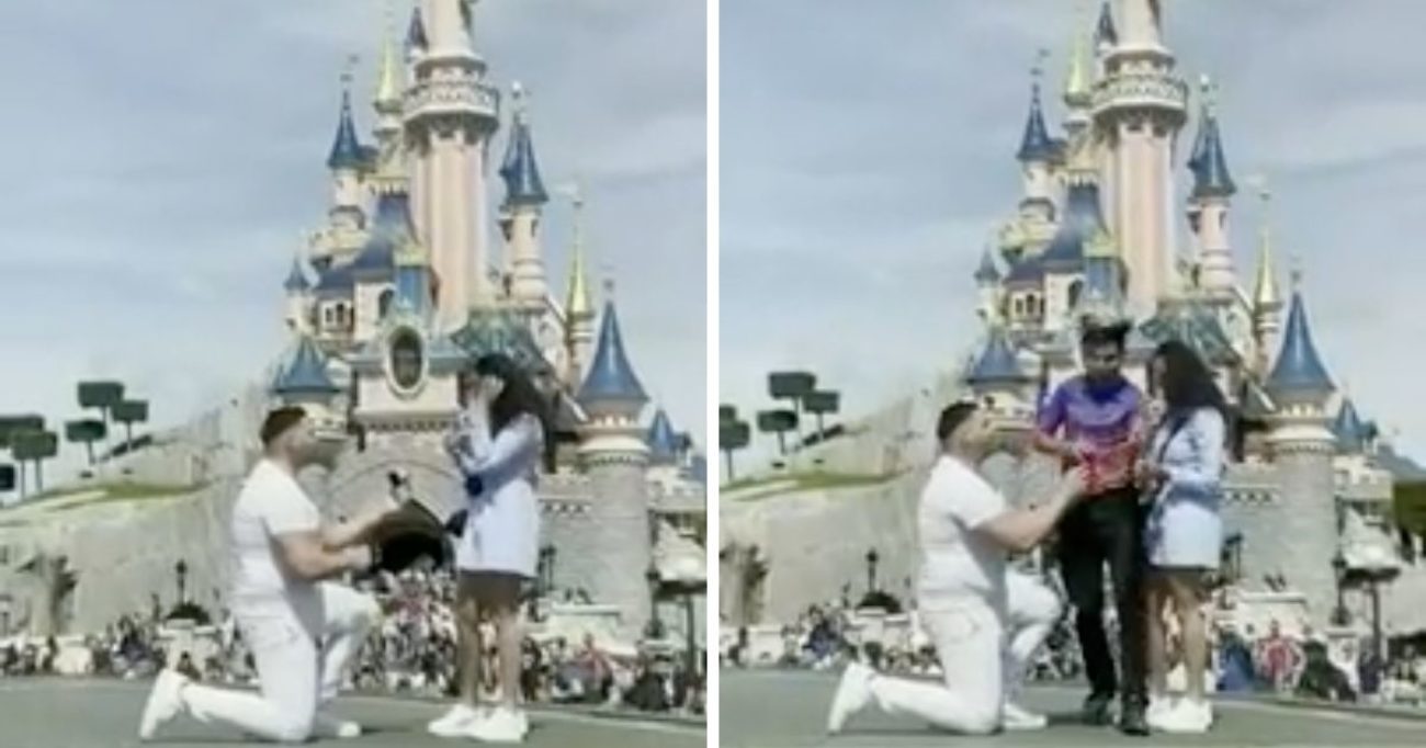 Una proposta di matrimonio durante una partita di calcio è stata rovinata da uno steward, che ha bloccato tutto pensando a un’invasione di campo.