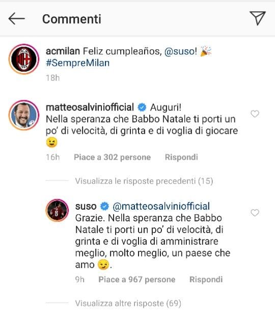 Salvini provoca Suso su Instagram. Il calciatore del Milan lo asfalta con una geniale replica