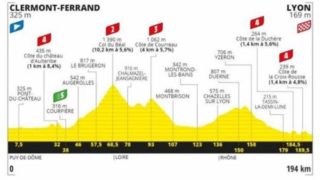 In tutto 194 chilometri, con partenza da Clermont-Ferrand e arrivo a Lione. Diversi i GPM di questa frazione, decisamente molto mossa. Si parte con la Cote du chateau d’Aulteribe (quarta categoria, 1 km all’8,4%), poi il Col du Bèal (seconda categoria, 10,2 km al 5,6%) e la Cote de Courreau (terza categoria, 4 km al 5,7%). Anche nel finale non mancano le insidie per i velocisti, che se vogliono giocarsi la vittoria in volata dovranno superare indenni negli ultimi 10 km altri due Gpm: la Cote de la Duchère (quarta categoria, 1,4 km al 5,6%) e la Cote de la Croix-Rousse (quarta categoria, 1,4 km al 4,8%) prima della discesa verso Lione.