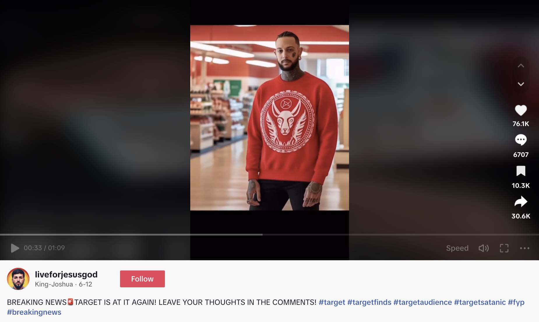 Oltre al video di Hobby Lobby citato sopra, due video di TikTok con immagini generate dall’intelligenza artificiale sostenevano che Target vendesse abbigliamento satanico. “Guardate queste immagini che sto per mostrarvi di ciò che Target ha in serbo per i nostri figli e per ognuno di voi”, ha affermato l’influencer cristiano di TikTok “King Joshua” in un video del 12 giugno 2023, prima di mostrare una serie di immagini che ritraggono un negozio con icone sataniche e un uomo che indossa abiti a tema satanico.