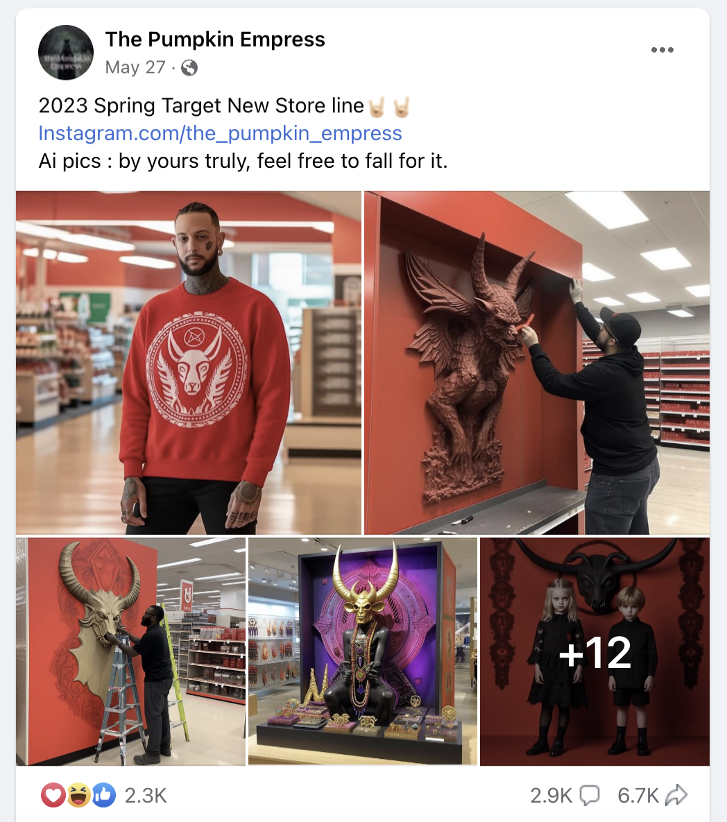In realtà, Target non vende i vestiti satanici mostrati da “King Joshua”. Le foto generate dall’IA sembrano provenire da un account Facebook chiamato “The Pumpkin Empress”, che ha postato i video sulla sua pagina nel maggio 2023 con la didascalia “AI pics: by yours truly, feel free to fall for it” (“Foto IA: a cura del sottoscritto, sentitevi liberi di cascarci”).