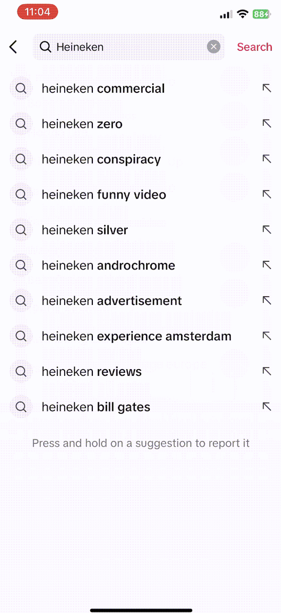 Ad esempio, quando un’analista di NewsGuard ha digitato “Heineken” nella barra di ricerca di TikTok il 13 luglio 2023, le frasi “Heineken conspiracy”, “Heineken androchrome” [sic] e “Heineken bill gates” sono apparse tra le ricerche suggerite.