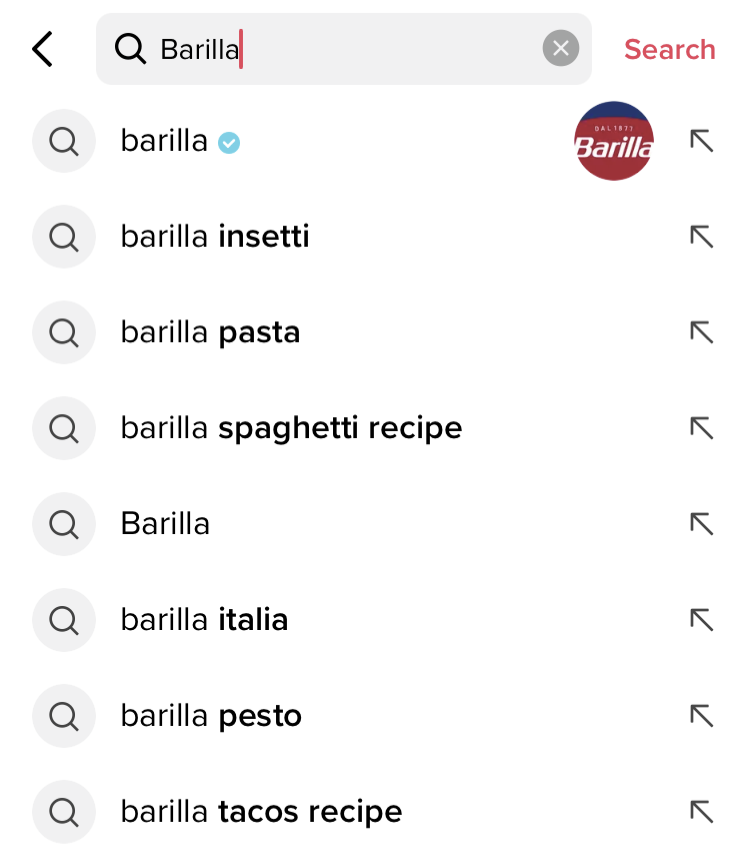 Le parole chiave di ricerca suggerite per “Barilla” su TikTok includono “Barilla insetti”. (Screenshot di NewsGuard)