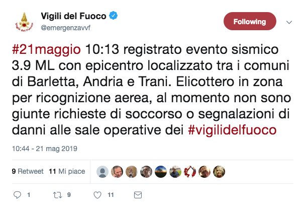 Tantissimi cittadini si sono riversati su Twitter preoccupati per la forte scossa. Un utente ha scritto: “Mai visto un terremoto così in Puglia”.