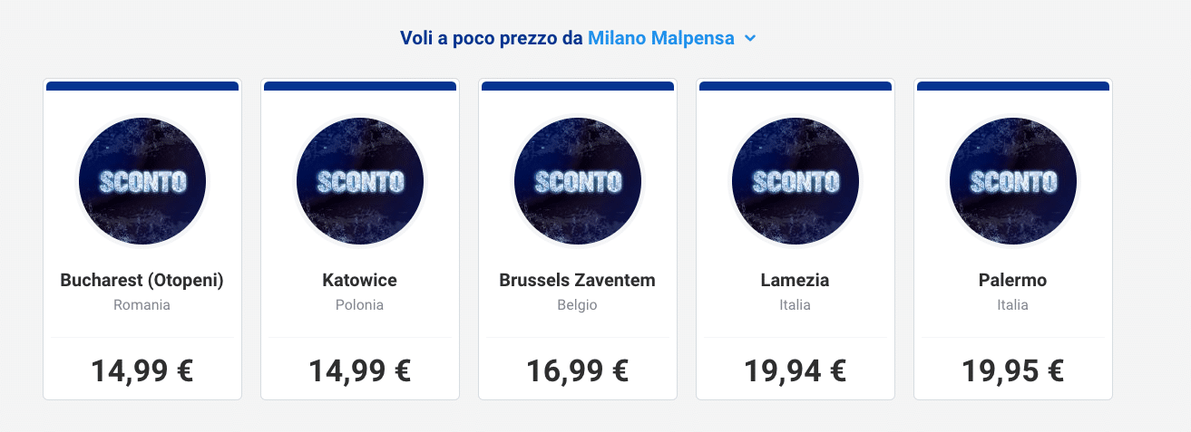 I biglietti partono dai 9,99 euro del viaggio per Amburgo, 25,49 per Atene e Madrid, Ibiza da 19,99 euro, fino ai 110 euro per Cork, in Irlanda. Gli aeroporti di partenza sono: Roma Ciampino, Roma Fiumicino, Treviso, Bologna, Pisa, Alghero, Ancona, Perugia, Parma, Torino e Verona, Milano Malpensa, Milano Bergamo.